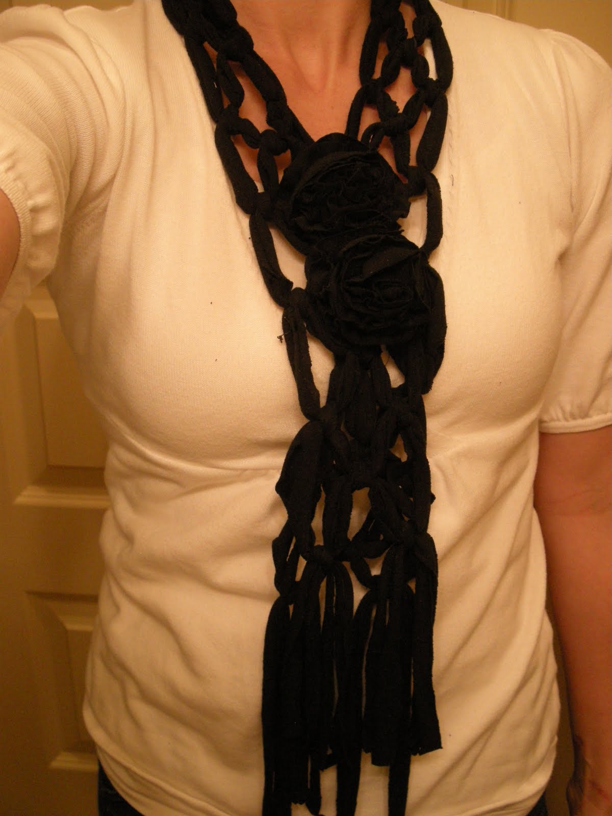 I took two shirts like this one and sewed down the top middle part to make it more of a V neck and then made flowers out of the other one. I also added some pink from another shirt.